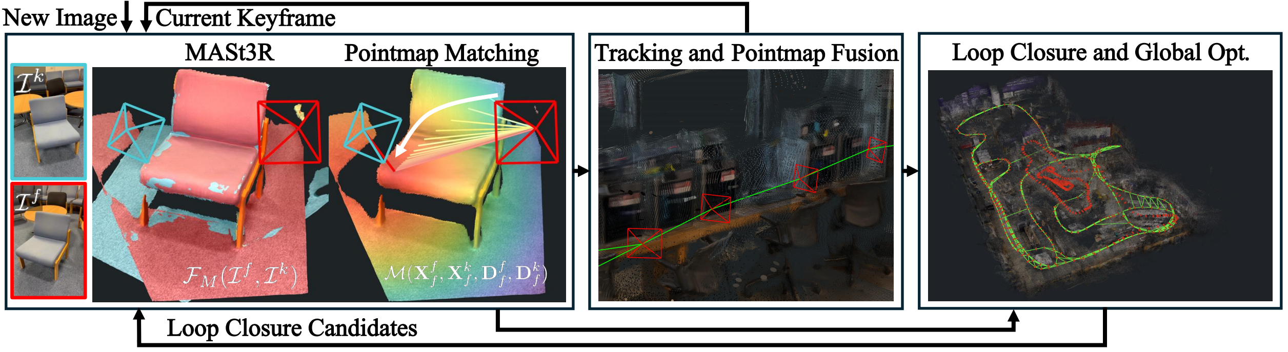 MASt3R-SLAM workflow for generating 3D point clouds from RGB video sequences